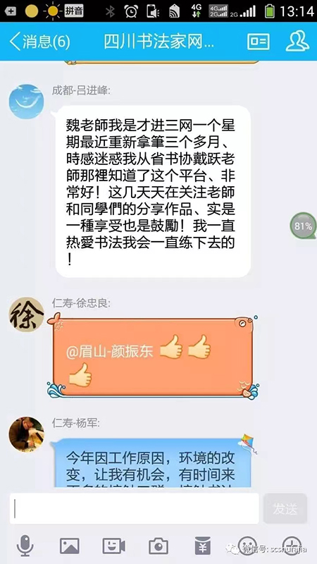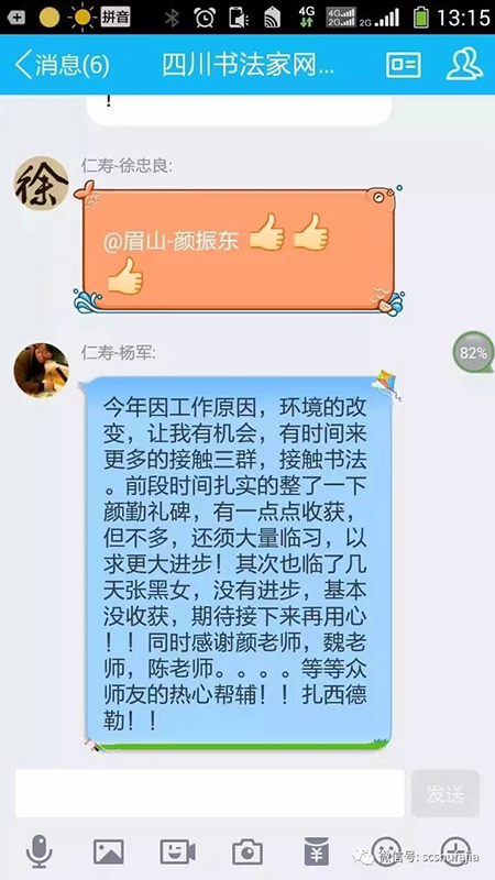 我之前加入過很多書(shu) 法群,基本上都是慘不忍睹,根本沒有什麽(me) 交流,全是廣告,自十月份偶然見到本群,欣然加入,更讓人欣慰的是這個(ge) 群充滿正能量,都是切切實實的在學書(shu) 法,還有顏老師,陳老師,白老師,魏老師等管理員的精心維護和不厭其煩的指導,在這裏道聲謝謝你們(men) ,辛苦了!