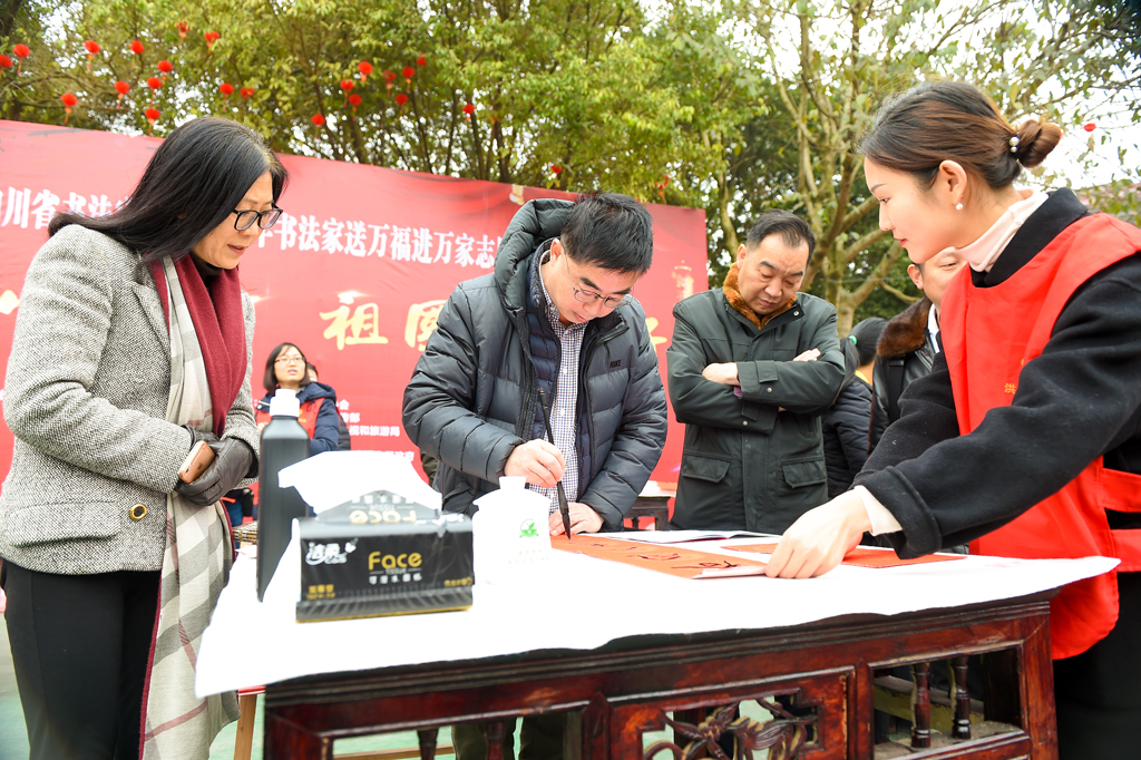 四川省文聯黨(dang) 組副書(shu) 記劉建剛,四川省書(shu) 協主席戴躍,眉山市文聯主席王莉茹,中共洪雅縣委常委、宣傳(chuan) 部部長李國華,洪雅縣人民政府副縣長薑定波,眉山市文聯秘書(shu) 長沈榮均,洪雅縣委宣傳(chuan) 部副部長、文聯主席李楊霞,洪雅縣文化廣播電視和旅遊局局長冉鋒,四川省書(shu) 協顧問徐德鬆,四川省書(shu) 協副主席鍾顯金、林嶠、王道義(yi) ,四川省書(shu) 協行草書(shu) 委員會(hui) 副主任、眉山市書(shu) 協主席楊江帆,四川省書(shu) 協副秘書(shu) 長唐昊、冷柏青、王書(shu) 峰,著名書(shu) 法家劉寧宇、孫培嚴(yan) 、周於(yu) 明、楊帆、郭彥飛、楊燕剛、劉舒、李家德、代明道、鄧長春、韓林宏、趙立、肖繼業(ye) 、王健、徐曉洪、餘(yu) 濤、王亮、王德躍、唐浩平、王方等齊聚洪雅縣中山鎮前鋒村,將濃濃的祝福遞送到老百姓手中,為(wei) 他們(men) 送上了新春的良好祝願。