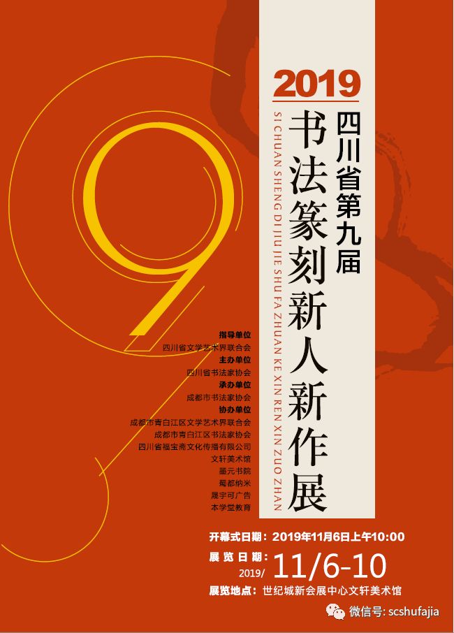 展覽通知:由四川省文學藝術界聯合會(hui) 指導,四川省書(shu) 法家協會(hui) 主辦,成都市書(shu) 法家協會(hui) 承辦的“四川省第九屆書(shu) 法篆刻新人新作展將於(yu) 11月6日上午10時在世紀城新會(hui) 展中心文軒美術館舉(ju) 行開幕式。