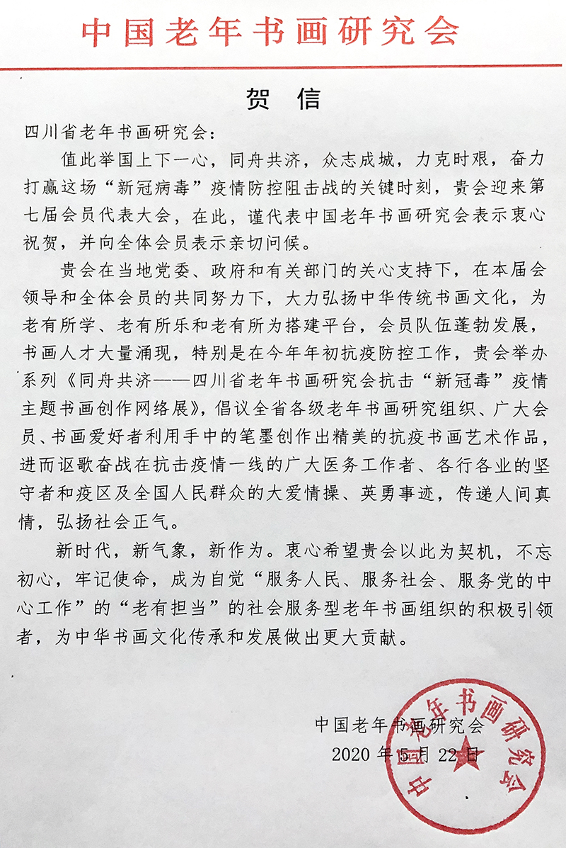 中國老年書(shu) 畫研究會(hui) 賀信