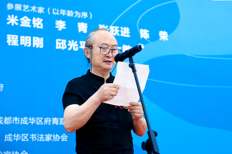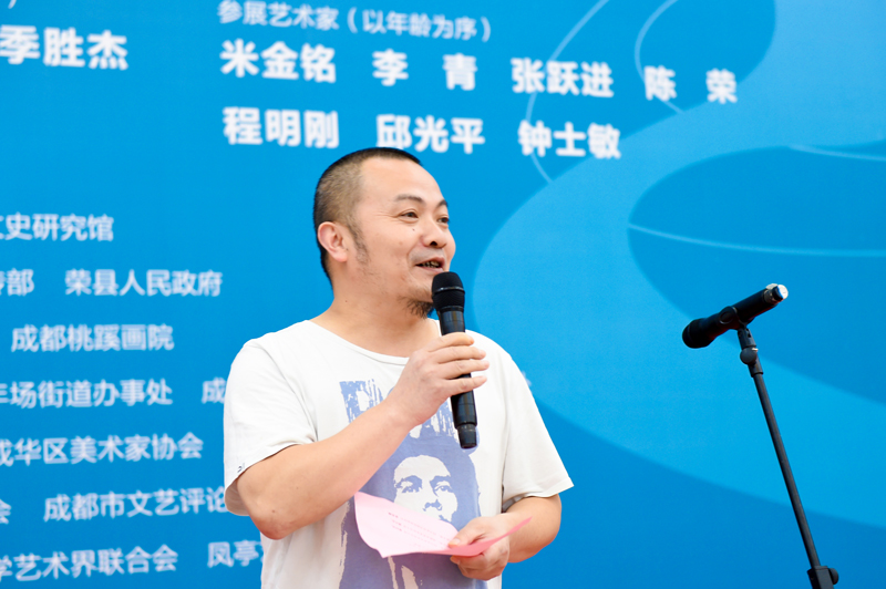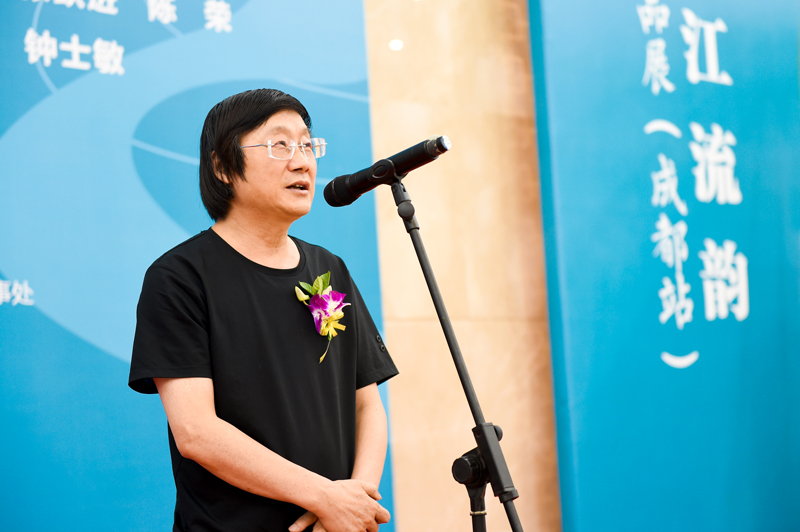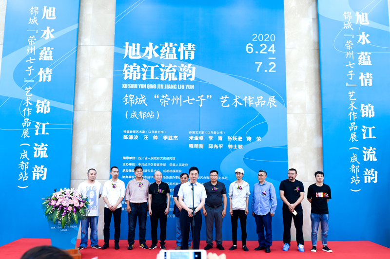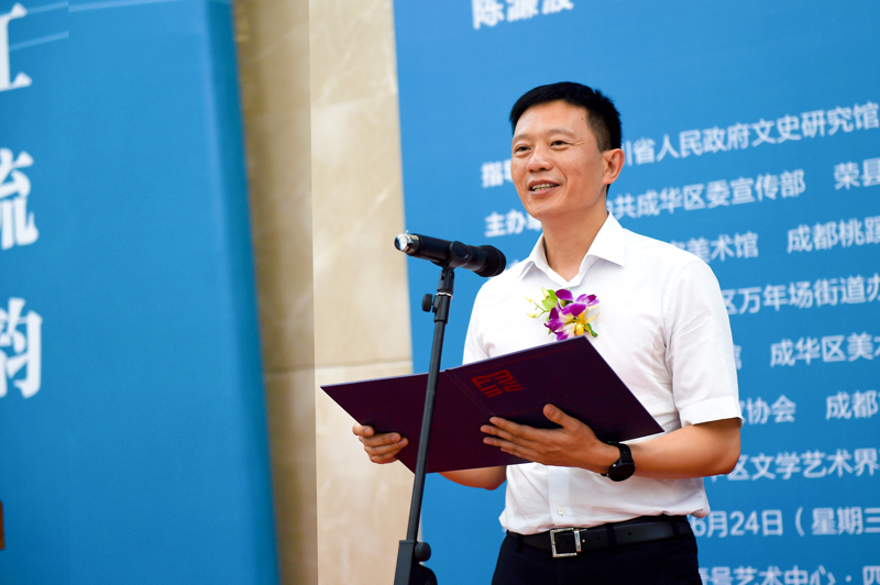 鄭小清代表中共榮縣縣委、榮縣人民政府致辭時表示,榮縣乃千年古縣,詩書(shu) 之鄉(xiang) 。蘊育出晚清第一詞人趙熙、延安五老之一吳玉章、清華大學現任校長邱勇等一大批文化名人。兩(liang) 地人傑地靈、文脈相連,而今,榮州七子走出榮縣,在成都礪煉成長,紮根藝術沃土,取得驕人成績,為(wei) 家鄉(xiang) 爭(zheng) 得榮光。拳拳赤子心,殷殷桑梓情,榮州七子對哺育他們(men) 的榮山旭水、父老鄉(xiang) 親(qin) 懷著深切的春戀和感激,對承載藝術夢想的希望之地,生活之所充滿著激情與(yu) 感恩。今天,他們(men) 以“旭水蘊情、錦江流韻”藝術作品展牽引兩(liang) 地,感念家鄉(xiang) 、致謝賓朋,為(wei) 兩(liang) 地人民奉獻了一場獨具地方特色和時代精神的藝術盛宴。他希望兩(liang) 地的藝術家們(men) 繼續以翰墨言誌,以丹青書(shu) 懷,積極為(wei) 兩(liang) 地友好合作,加快發展搭建藝術之橋。