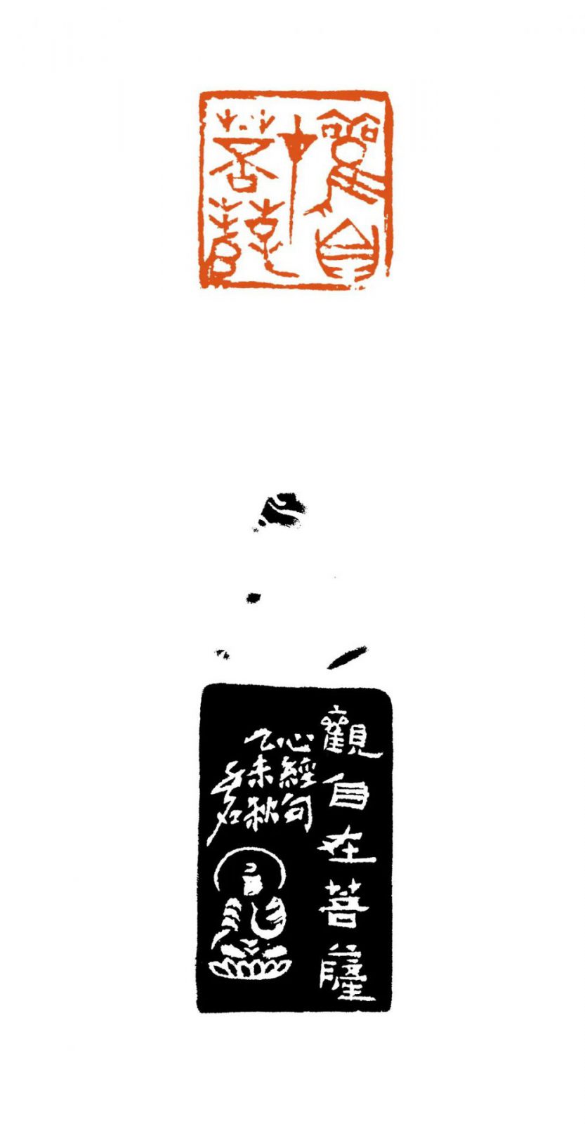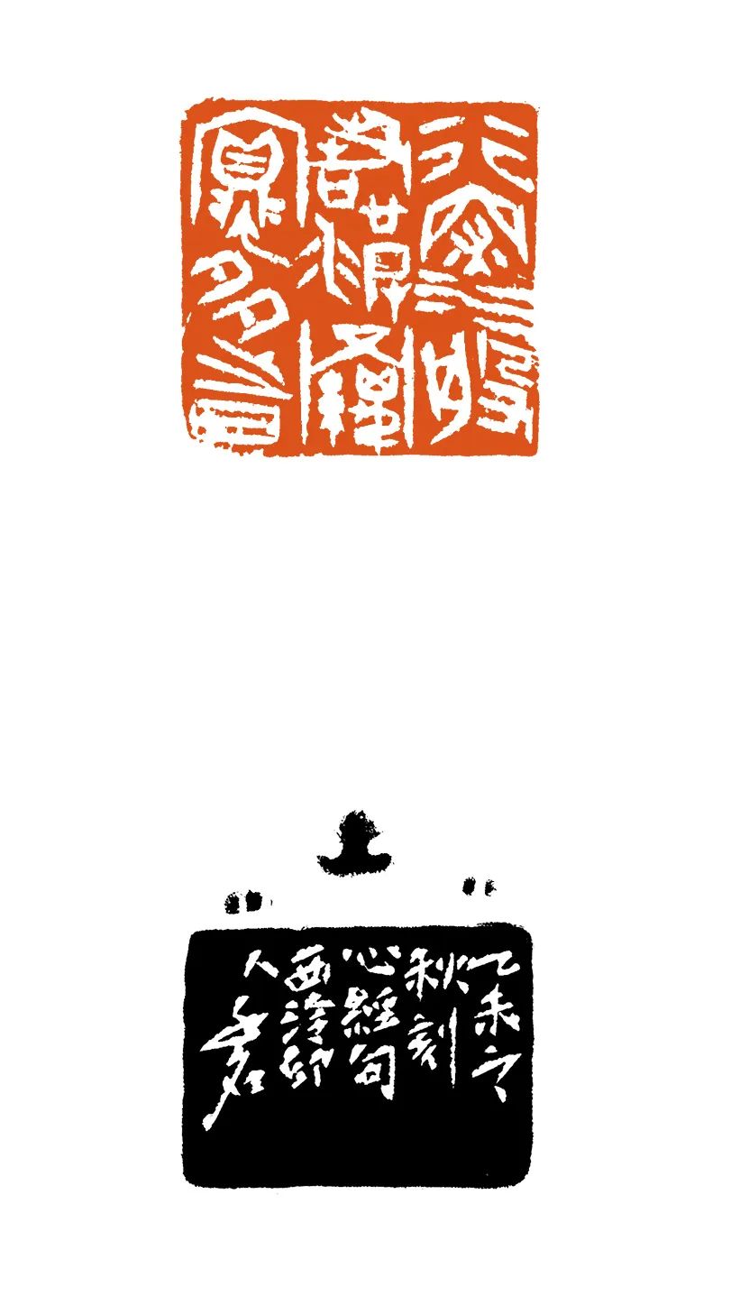 譬如作品集中首枚朱文印“般若波羅蜜多心經”。“般若”二字斜線的律動變化;“波”字水的四個(ge) 點,與(yu) 左邊“經”的三個(ge) 點相呼相應;以及“羅”字結構中的“糸”,其狀不僅(jin) 與(yu) 左下、右下的點成三角形引勢關(guan) 聯,而且其份量有如定音鼓的一記強音,敲在了整個(ge) 作品節律的黃金分割點位。由此也鋪開了《心經》全套54方印的序曲——宏大、溫婉、多變、生生不息。