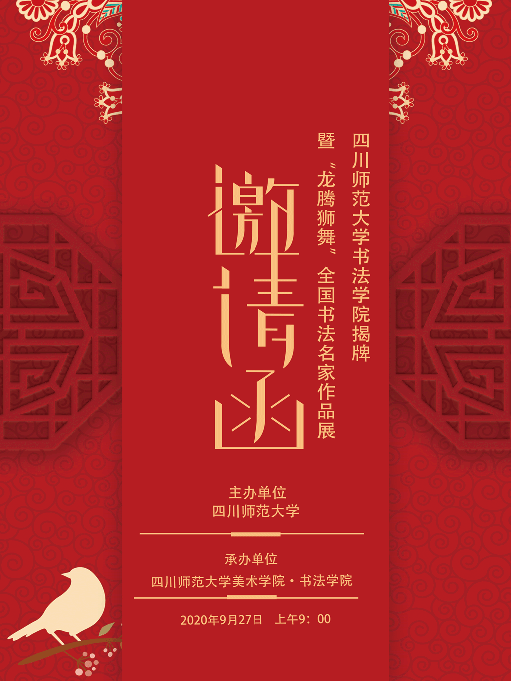 為(wei) 深入貫徹落實黨(dang) 的十九大以來重要精神和習(xi) 近平新時代中國特色社會(hui) 主義(yi) 文藝思想,大力弘揚傳(chuan) 承中華優(you) 秀傳(chuan) 統文化,努力提升當代大學生的人文素質和審美修養(yang) ,為(wei) 社會(hui) 培育更多優(you) 秀人才和開展書(shu) 法研究、社會(hui) 服務、藝術傳(chuan) 播活動,促進教育事業(ye) 的全麵發展,經籌備,茲(zi) 定於(yu) 2020年9 月27 日上午9:00-11:00在四川師範大學成龍校區第四實驗樓舉(ju) 行“四川師範大學書(shu) 法學院”成立揭牌暨“龍騰獅舞”全國書(shu) 法名家作品邀請展開幕式,誠邀出席。