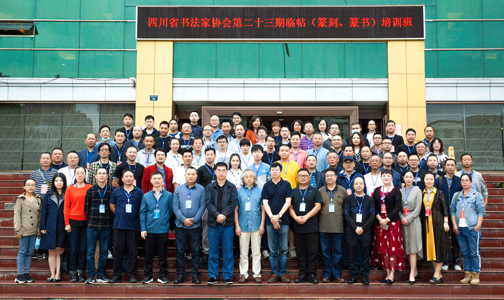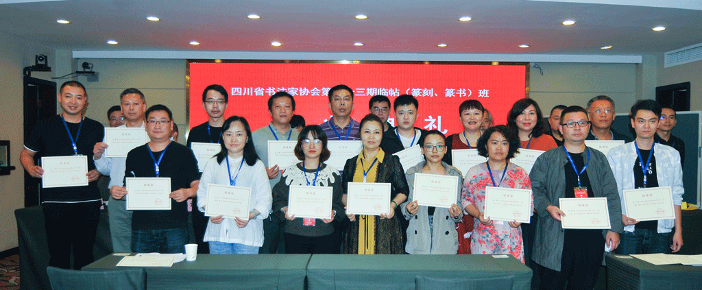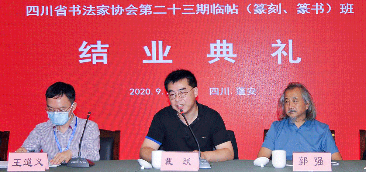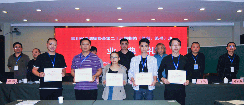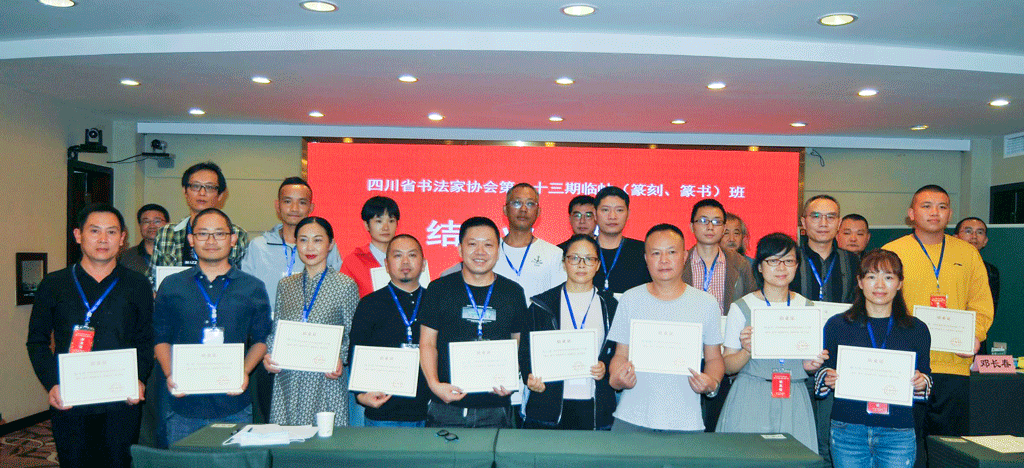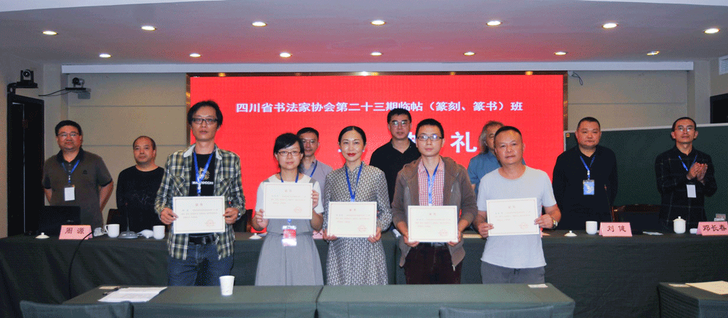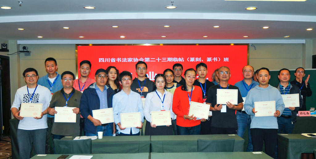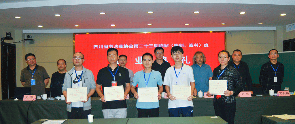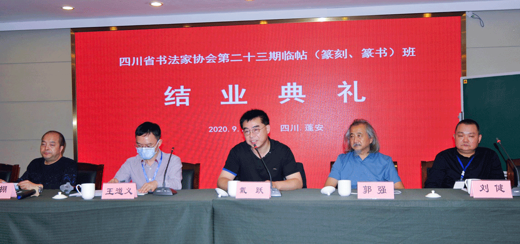 當天晚上19:30,“四川省書(shu) 法家協會(hui) 第二十三期臨(lin) 帖(篆刻、篆書(shu) )班”舉(ju) 行結業(ye) 典禮。中國書(shu) 法家協會(hui) 理事、四川省書(shu) 法家協會(hui) 主席戴躍,中國書(shu) 法家協會(hui) 篆刻委員會(hui) 委員、西泠印社理事、四川省書(shu) 法家協會(hui) 顧問郭強,四川省書(shu) 法家協會(hui) 副主席兼正書(shu) 委員會(hui) 主任、教育委員會(hui) 主任、培訓中心主任、西泠印社社員王道義(yi) ,四川省書(shu) 法家協會(hui) 副主席兼篆刻委員會(hui) 主任劉健,輔導教師許棚、鄧長春、周源等及全體(ti) 學員參加結業(ye) 典禮。王道義(yi) 主持結業(ye) 典禮並作教學、教務等工作總結。