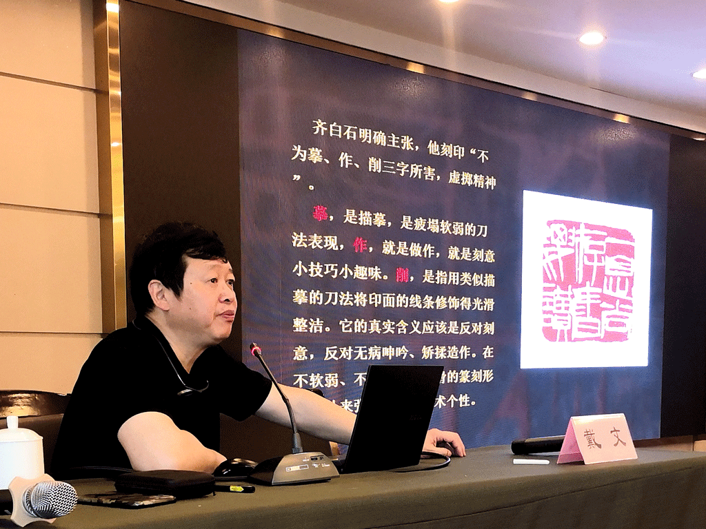 28日上午9:00,戴文又為(wei) 培訓班學員作了“篆刻做印法概述”專(zhuan) 題講座。他分別介紹了篆刻藝術立場下篆刻做印法概念的界定,篆刻史上對篆刻做印法的兩(liang) 種不同觀點價(jia) 值,當代篆刻藝術的發展和篆刻做印法的演變等。他還談到展覽的書(shu) 法形式與(yu) 現實思考和展覽落選作品存在的諸多問題。