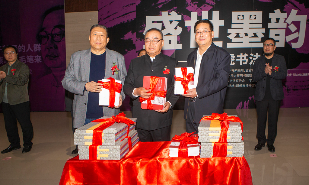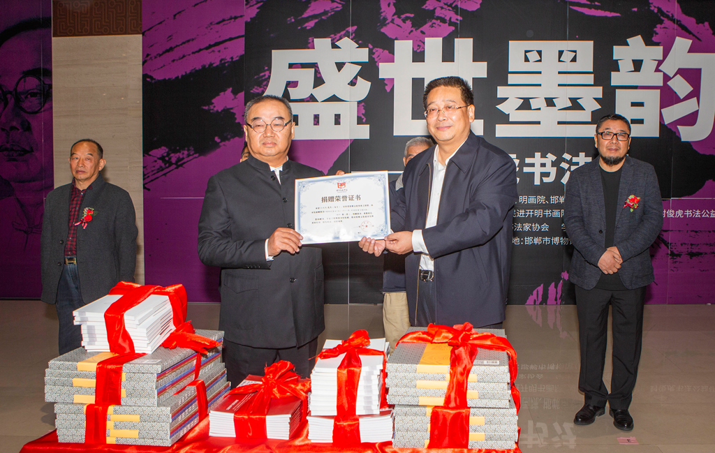 在開幕式上,封俊虎先生向邯鄲市博物館、圖書(shu) 館捐贈了他主編的《張裕釗書(shu) 法三帖》、《匠心之美——封俊虎書(shu) 法作品集》和《俊虎墨妙》等文獻書(shu) 籍。邯鄲市博物館馬小青館長、圖書(shu) 館祁向東(dong) 館長接受捐贈,並向封俊虎先生頒發了受贈證書(shu) 。