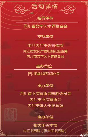 2020年12月18日上午10時,由四川省書(shu) 法家協會(hui) 主辦,四川省書(shu) 法家協會(hui) 篆刻委員會(hui) 會(hui) 、內(nei) 江市書(shu) 法家協會(hui) 、內(nei) 江市張大千紀念館承辦的《四川省第七屆篆刻藝術作品展》將在張大千美術館大廣場舉(ju) 行開幕式。