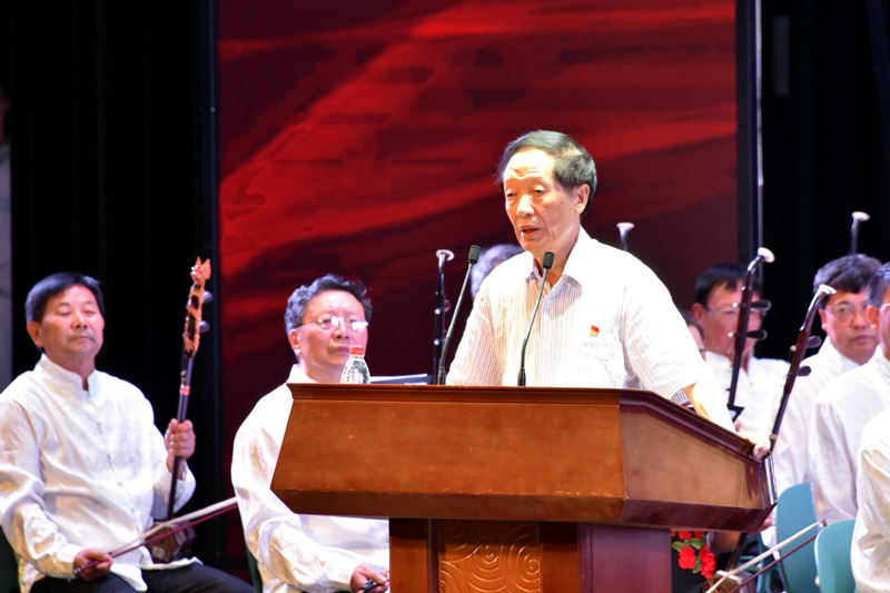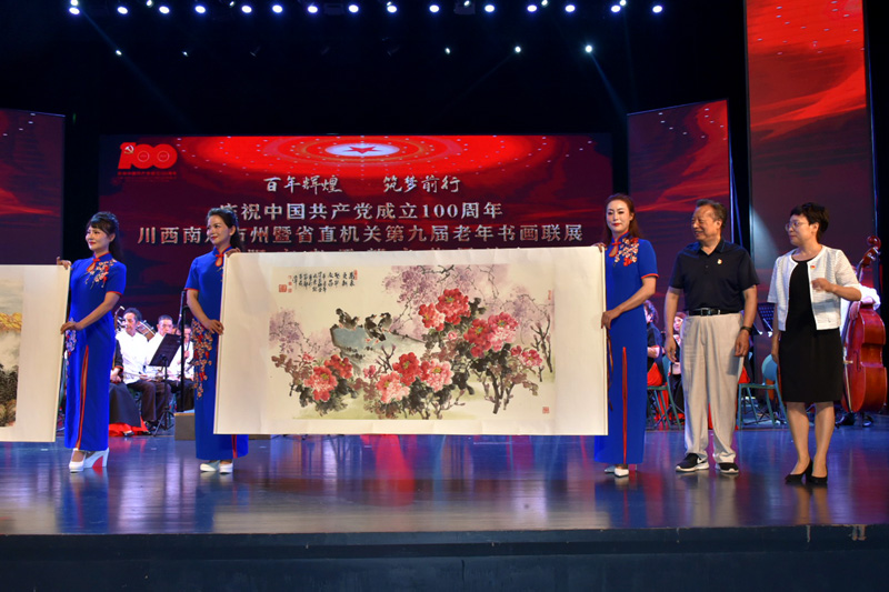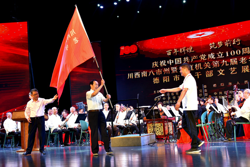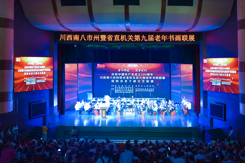 開幕式前,由德陽市老幹部唱主角的《百年輝煌,築夢前行》的文藝演出在德陽市演藝中心隆重舉(ju) 行。(四川省老年書(shu) 畫研究會(hui) 許莉 武蜀西)