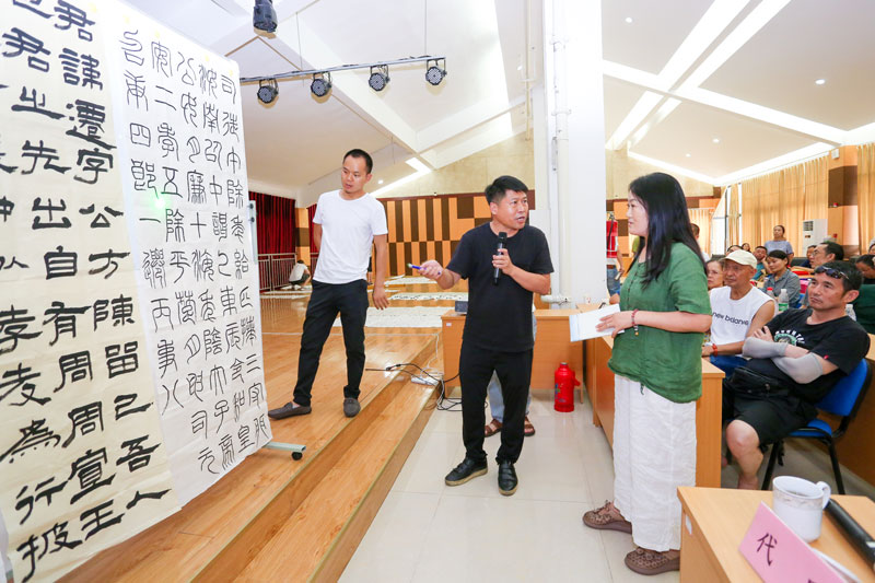 下午,在文藝中心學術報告廳開展針對中國書(shu) 協“第九屆中國書(shu) 壇新人新作展覽”、四川省書(shu) 協“傳(chuan) 承與(yu) 創新·四川省第四屆臨(lin) 書(shu) 臨(lin) 印展”等展覽活動備稿的看稿交流會(hui) 。來自德陽四縣(市)二區的骨幹作者和愛好者200餘(yu) 人齊聚一堂,作品五體(ti) 兼備、琳琅滿目,依次在展示板上貼出。代躍、王道義(yi) 、林嶠針對作者全部作品,從(cong) 筆法、結字、墨法、章法、文本、氣韻、書(shu) 寫(xie) 材料、印章使用等方麵進行細致深入的點評,提出改進提高意見。大家紛紛表示,參加這次活動受益匪淺,這是對德陽地區書(shu) 法篆刻精進的一次有力推動。