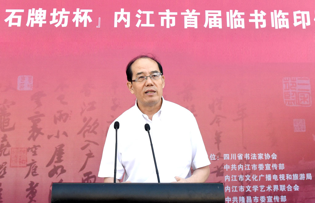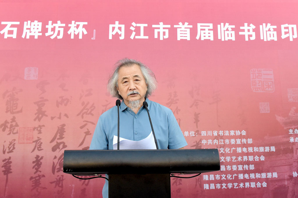 劉強代表隆昌市委市政府向出席開幕式的客位領導、書(shu) 法家,來賓朋友們(men) 表示熱烈的歡迎和誠摯的問候!他說,隆昌是中國石牌坊之鄉(xiang) ,現存石牌坊共17座,每座牌坊上麵都雕刻著栩栩如生的人物、花烏(wu) ,動植物等圖案,圖案造型講究,雕工精美,無論是功德牌坊、警示牌坊,節孝牌坊還是百壽牌坊,在修造,雕刻,篆寫(xie) 文筆等方麵都極其講究,牌坊上寫(xie) 的文字,圖案顧具深刻的思想內(nei) 涵、高深的文化和生活哲理,這次舉(ju) 辦“石牌坊杯內(nei) 江市首屆臨(lin) 書(shu) 臨(lin) 市作品展”,通書(shu) 法藝術形式對牌坊文化的肯定和宣傳(chuan) ,是對優(you) 秀傳(chuan) 統文化藝術進行深入研究、發掘、借鑒和化取,也是提升當代書(shu) 法篆刻創作水平的重要途徑,必將推動內(nei) 江書(shu) 法篆刻藝術傳(chuan) 承與(yu) 發展,也將進一步步擦亮隆昌牌坊文化名片。