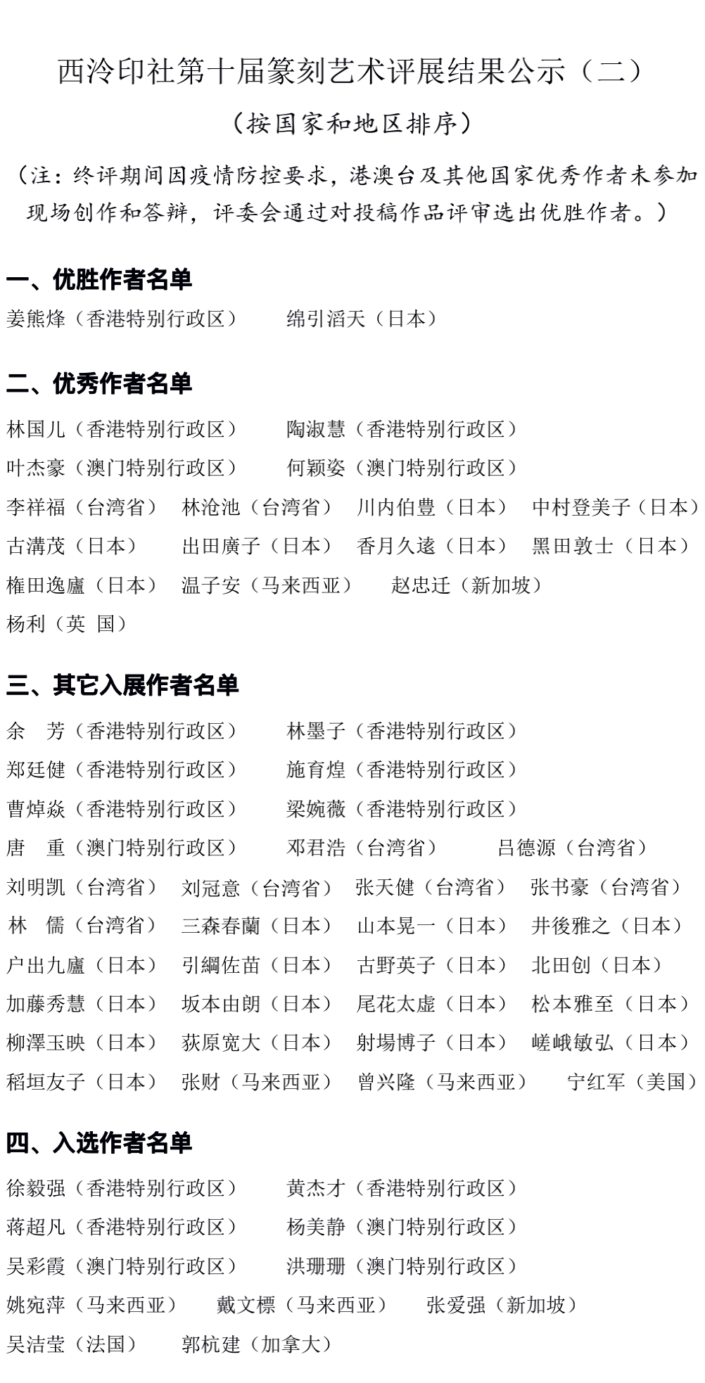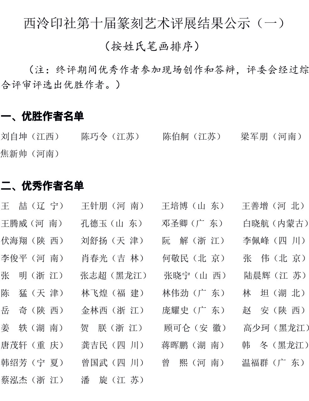 西泠印社第十屆篆刻藝術評展經過初評、複評、終評以及麵試答辯,共評選出入選作者183人,入展作者145人(其中優(you) 秀作者42人,優(you) 勝作者5人);港澳台及海外其他國家入選作者11人,入展作者51人(其中優(you) 秀作者16人,優(you) 勝作者2人)。